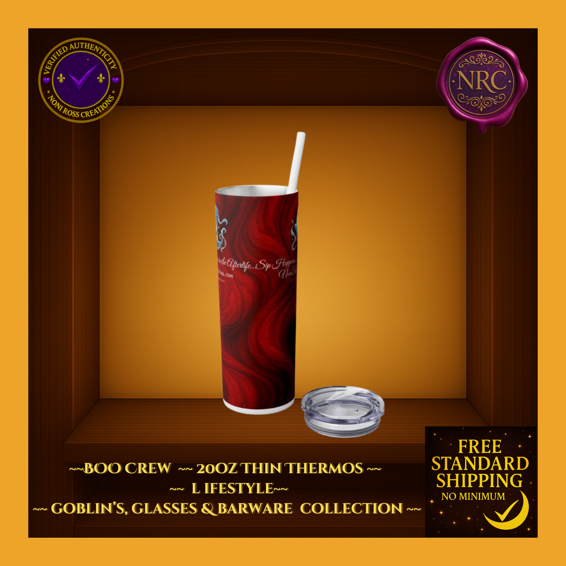 Enjoy your drinks with a dash of playful spookiness using our Phantom Sips Thin Thermos from the BOO Crew Collection! Wrapped in a swirling blood-red background and featuring your adorable ghost, this slim, 20oz thermos keeps beverages hot or cold for hours. Perfect for iced lattes, smoothies, or warm drinks on the go, the clear lid and reusable straw make sipping easy while preventing spills.