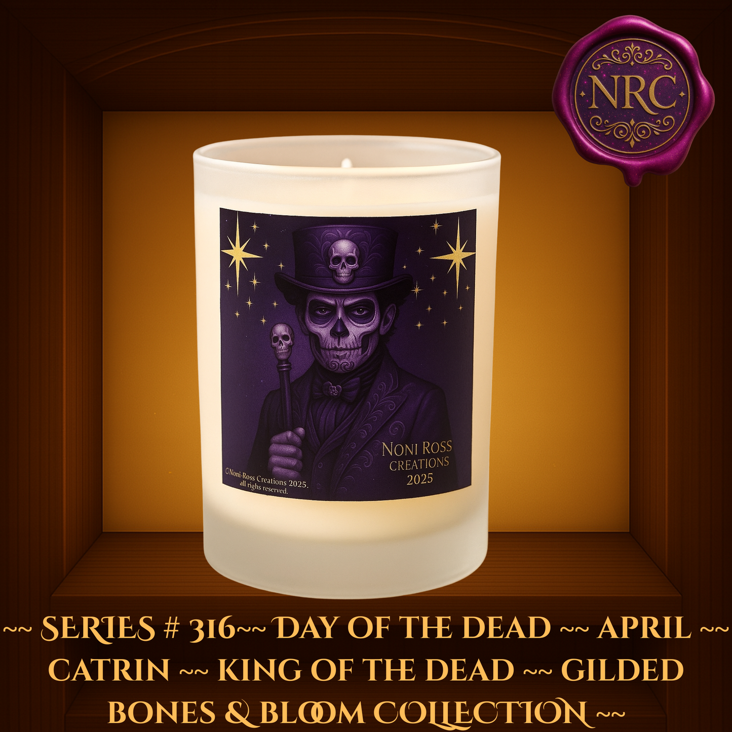 Embrace the mystical depths of April with the Series #316 April Day of the Dead Catrin Candle by Noni Ross Creations. This powerful candle showcases the April Catrin—King of the Dead—dressed in rich purple attire with a skull-adorned top hat and cane, framed by glowing golden stars scattered across a midnight violet backdrop.