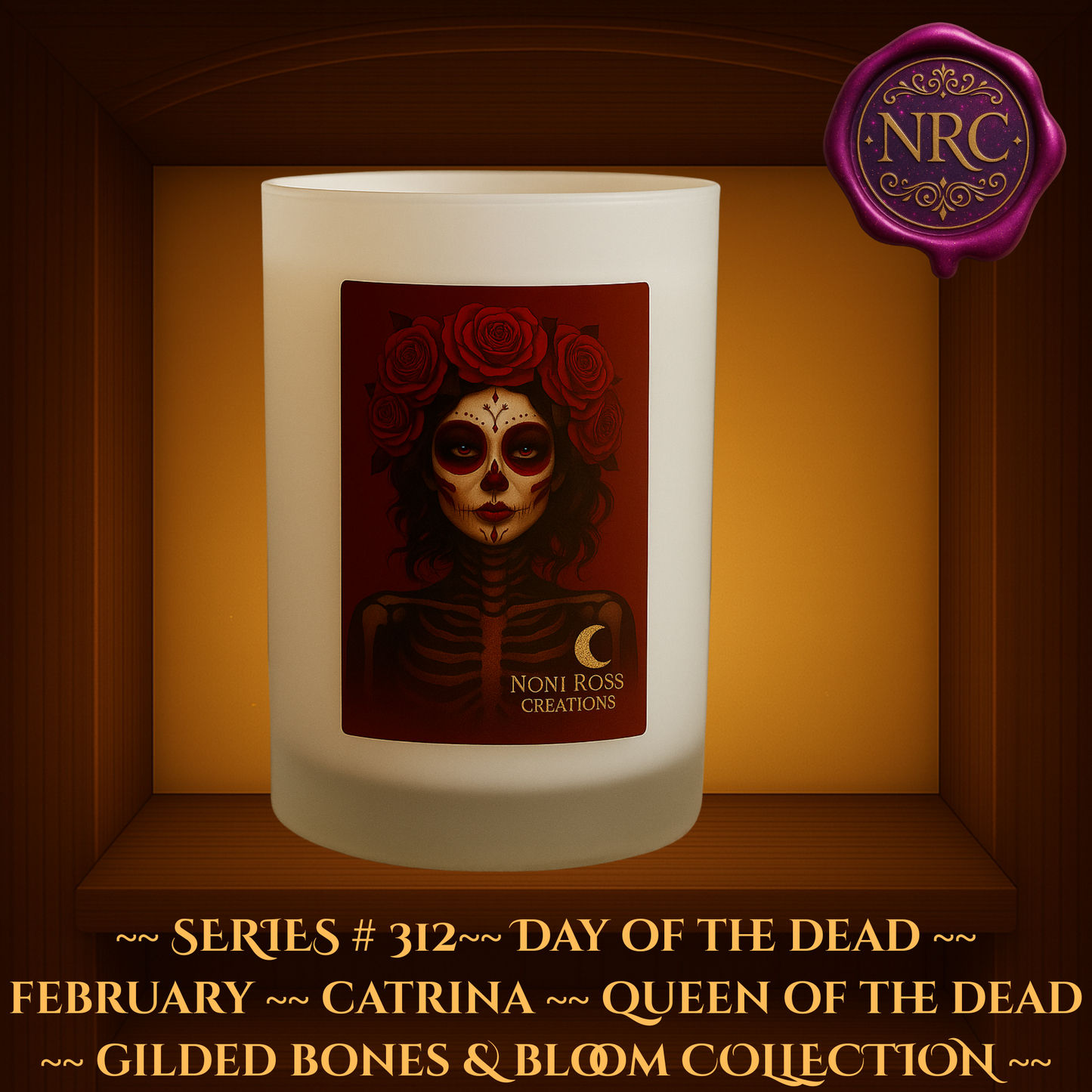 Celebrate the month of love with gothic allure through the Series #312 February Day of the Dead Catrina Candle by Noni Ross Creations. This enchanting candle features the February Catrina—Queen of the Dead—draped in romantic shades of deep crimson and black lace, her skeletal face adorned with heart-shaped sugar skull details and swirling rose patterns. She stands against a dark red backdrop scattered with floating petals and shimmering golden stars, evoking the haunting beauty of love beyond life.