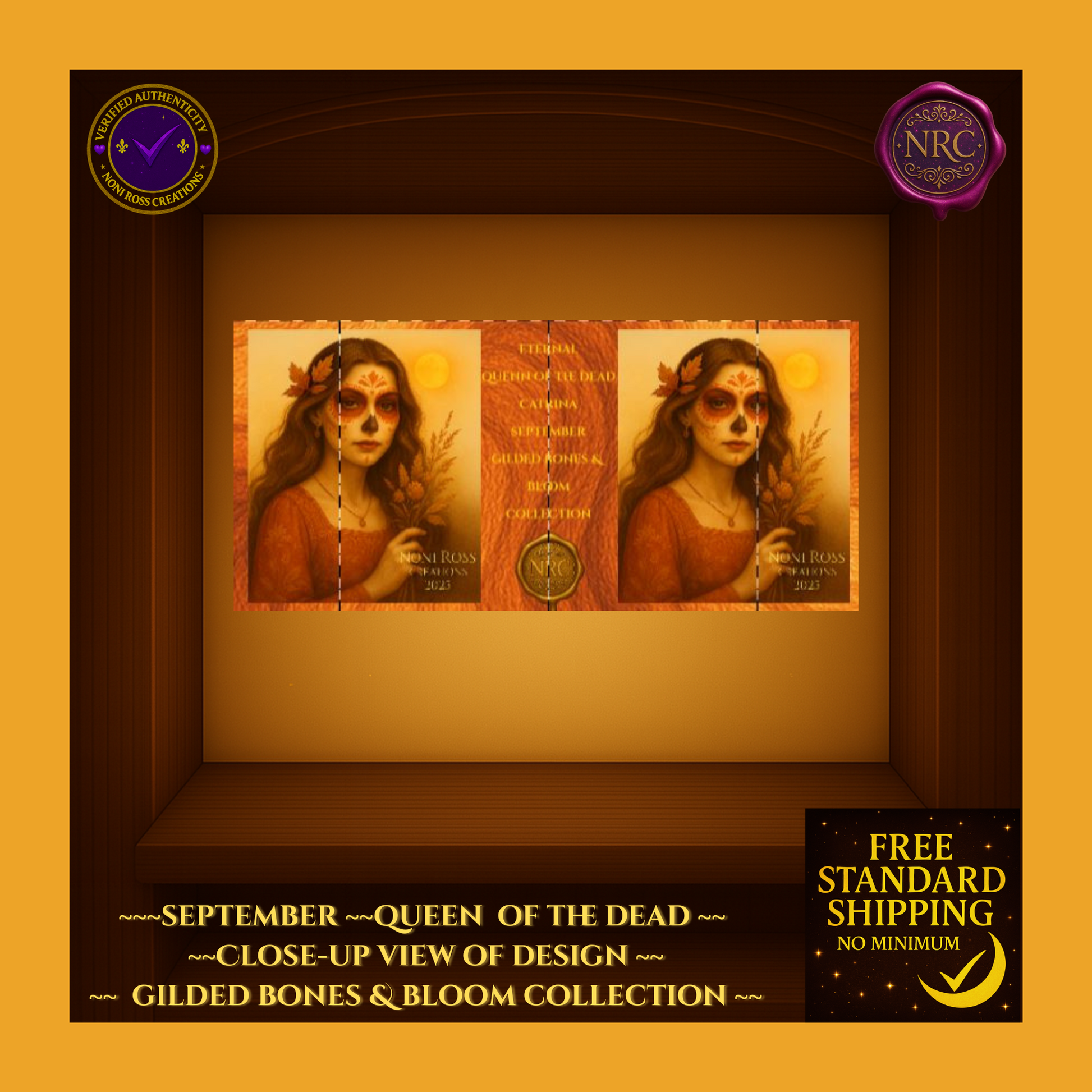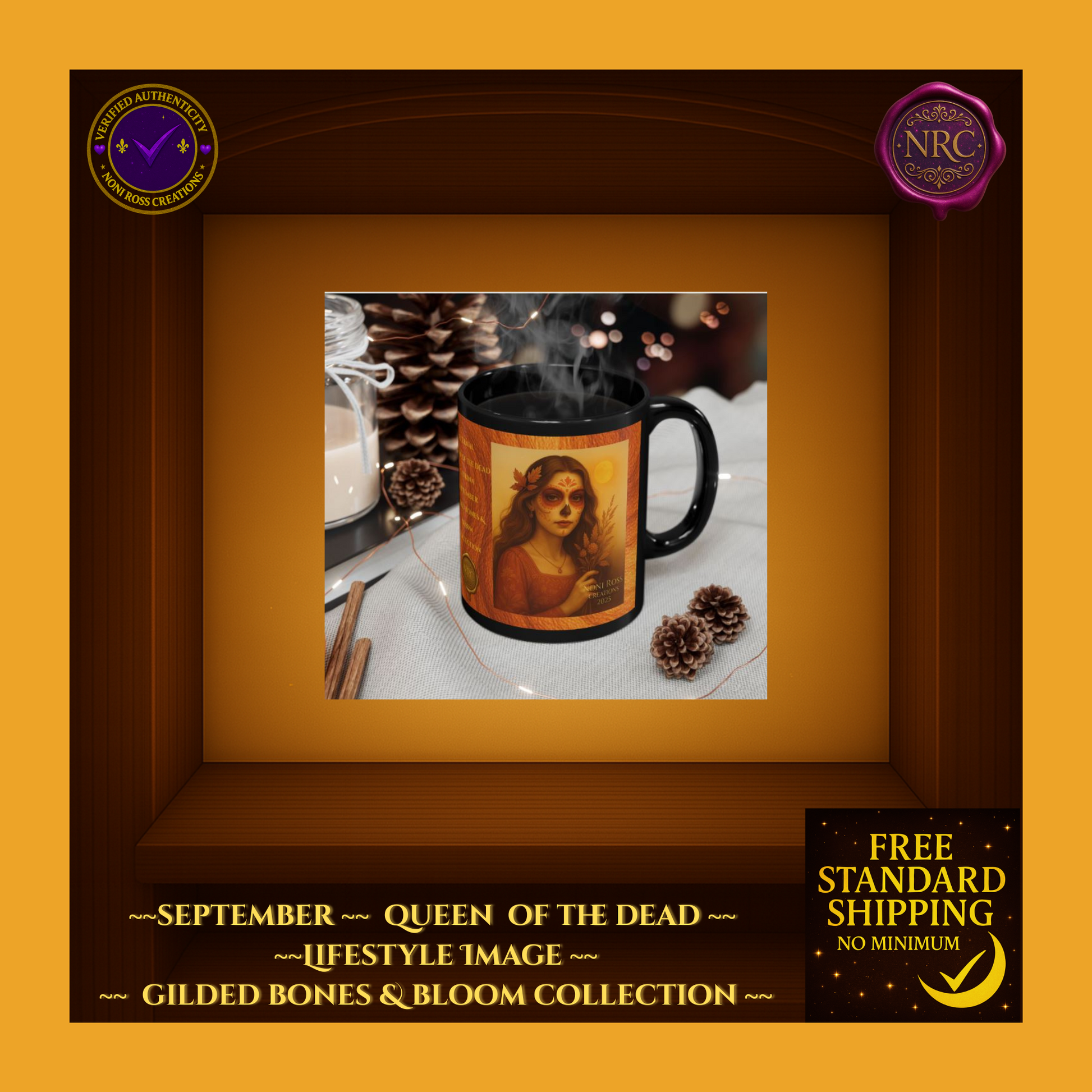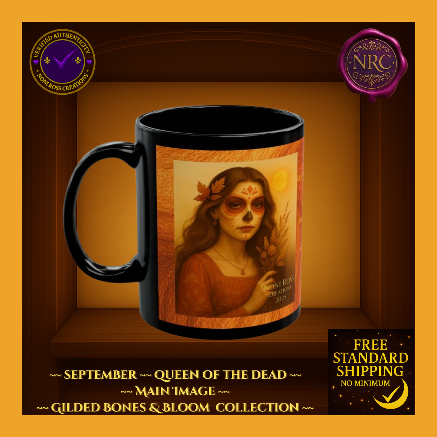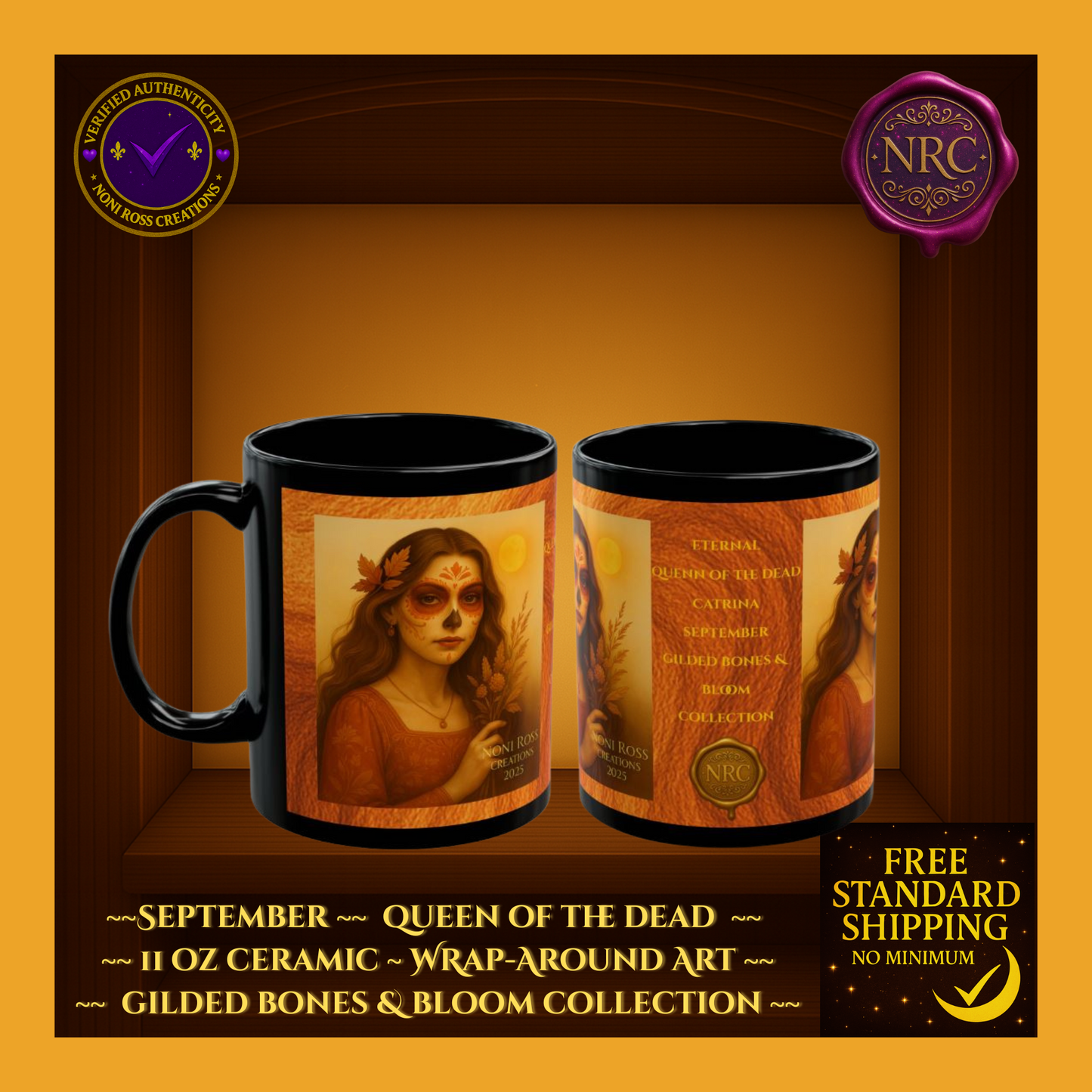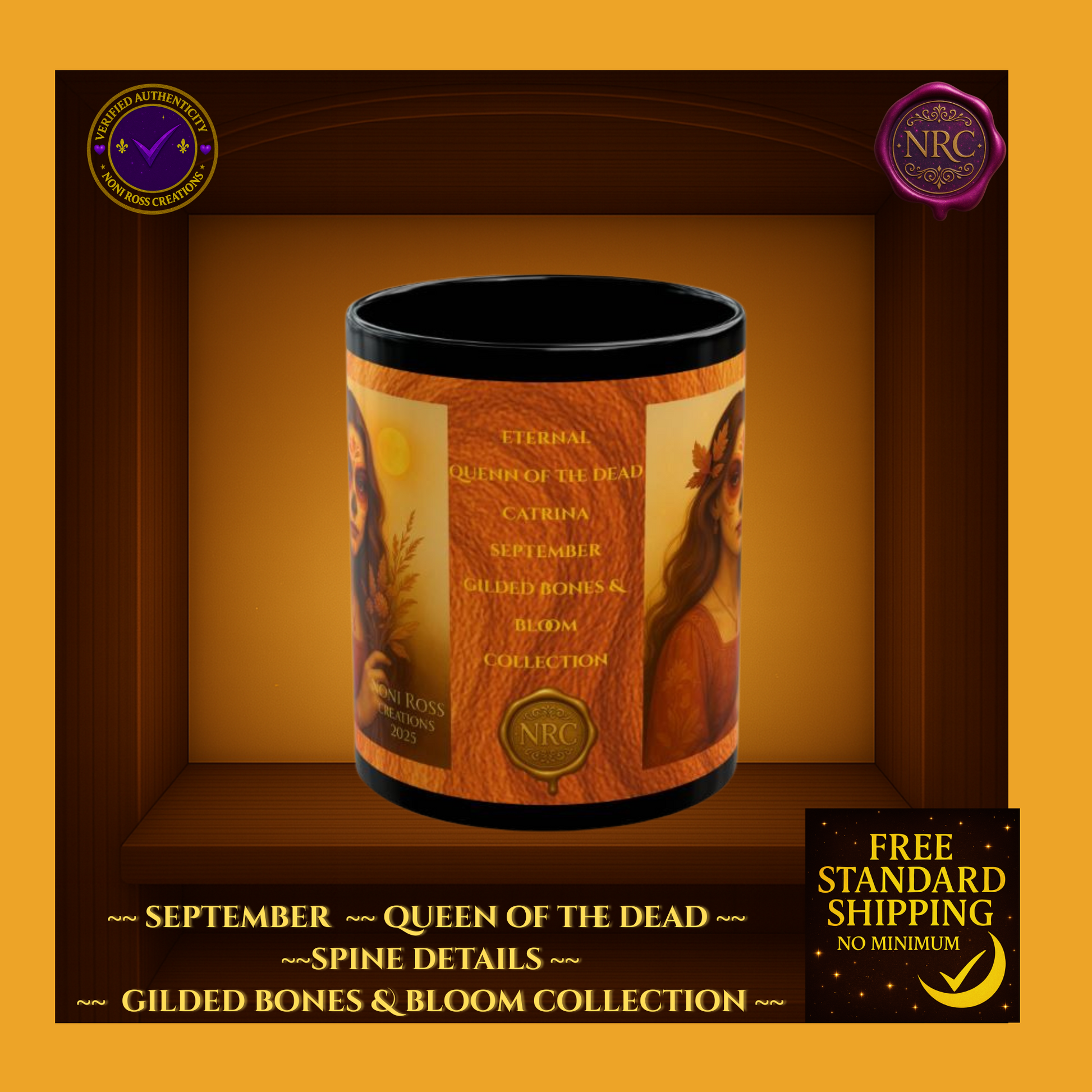 Welcome the beauty of autumn with the Eternal Series #118 September Catrina Mug from the Gilded Bones & Bloom Collection by Noni Ross Creations. This captivating black ceramic mug features an enchanting Catrina dressed in rich autumn-orange tones, with delicate sugar skull makeup and golden leaves in her flowing hair. She holds a bundle of wheat, symbolizing the harvest, set against a warm golden sunset backdrop. Perfect for cozy fall mornings or as a unique September birthday gift, this mug is microwave- and dishwasher-safe for daily use. Enjoy free standard US shipping with no minimum and unlock exclusive bundle savings when paired with matching journals or candles.