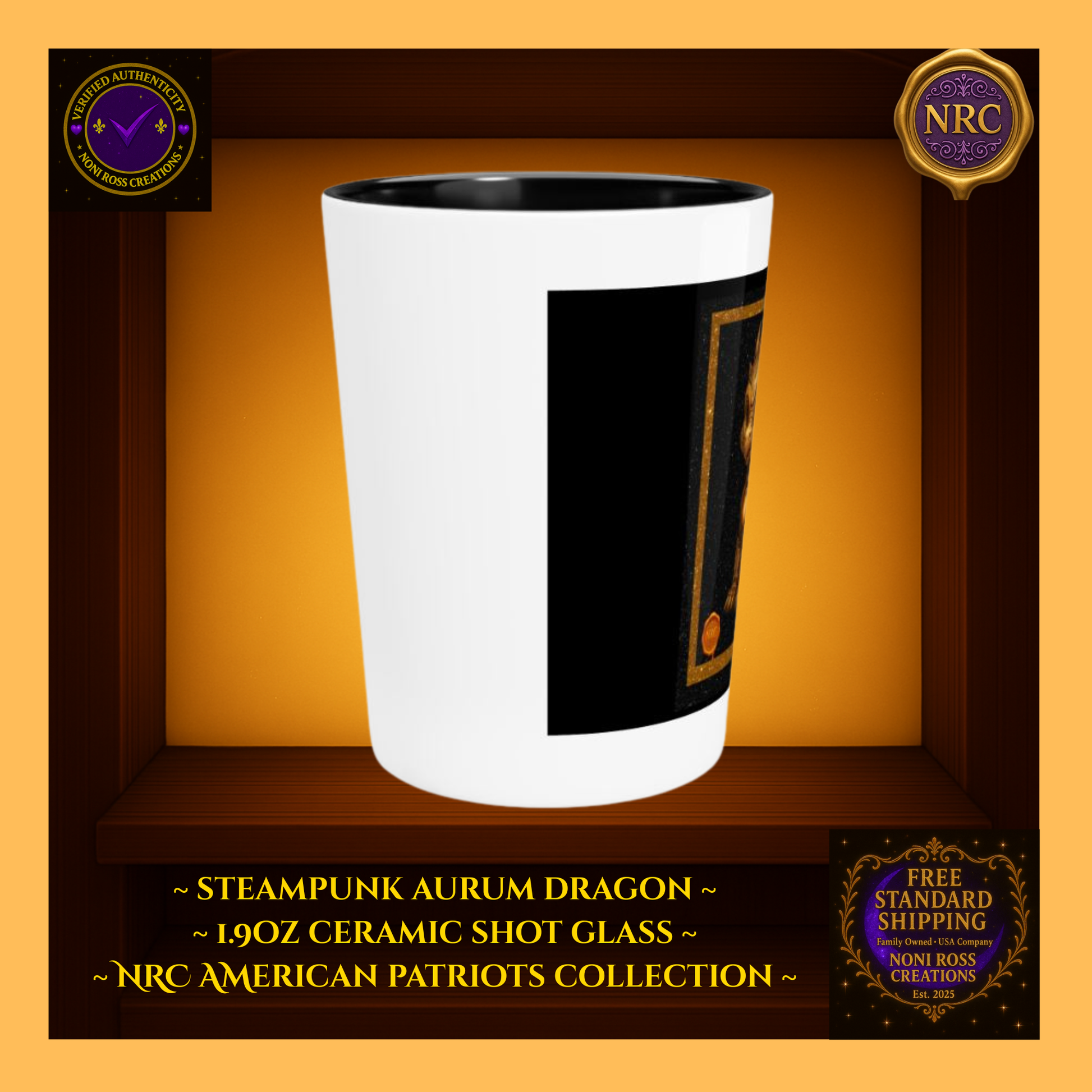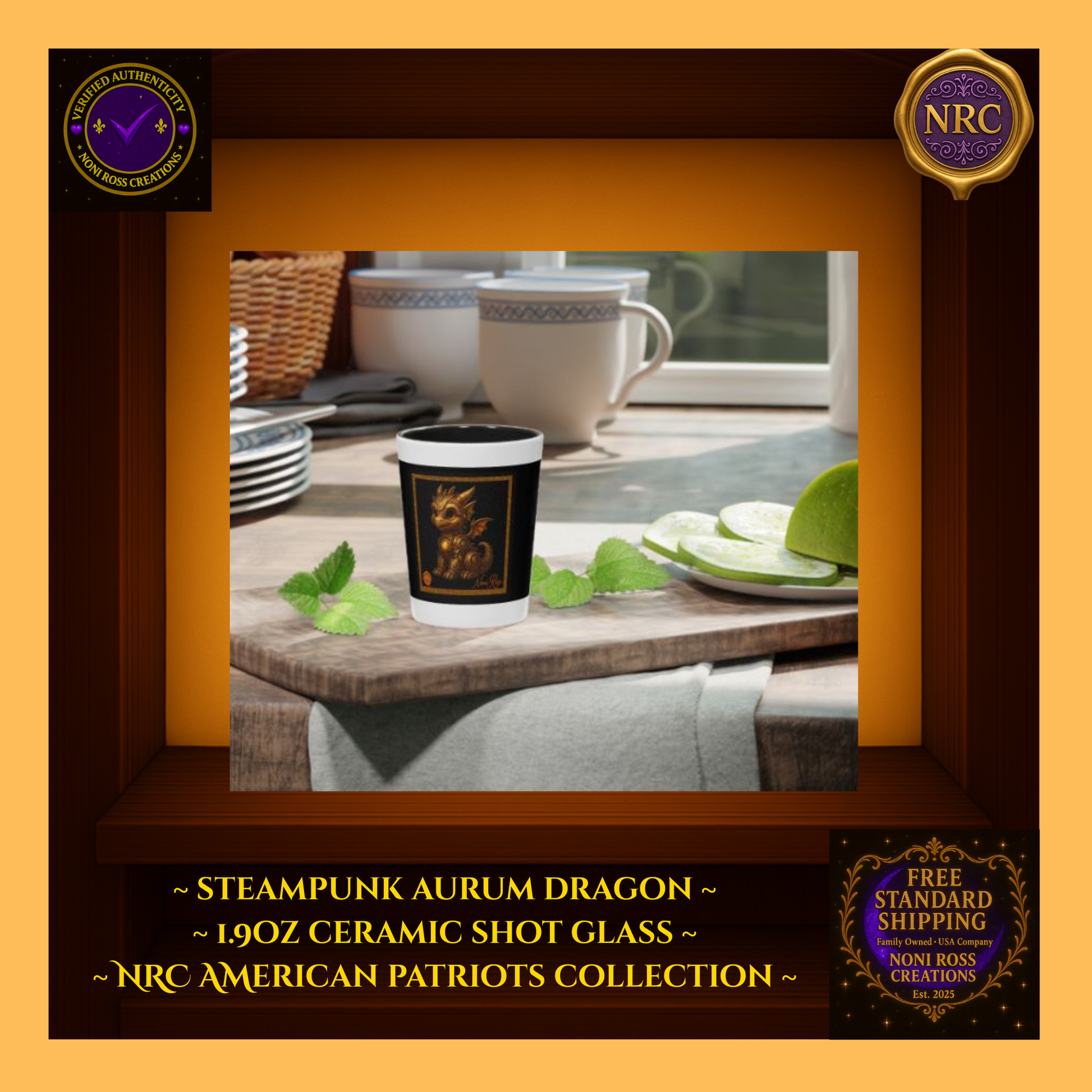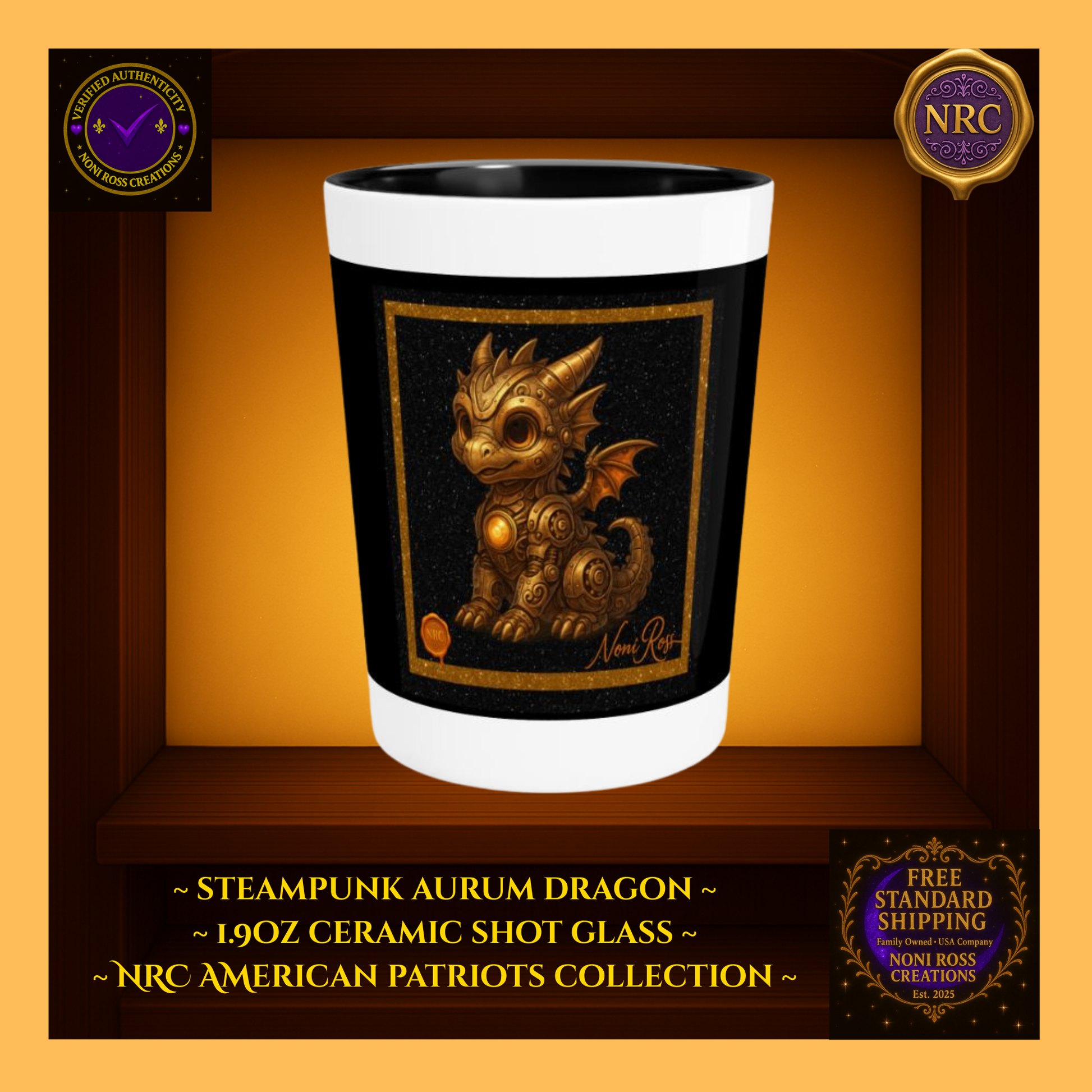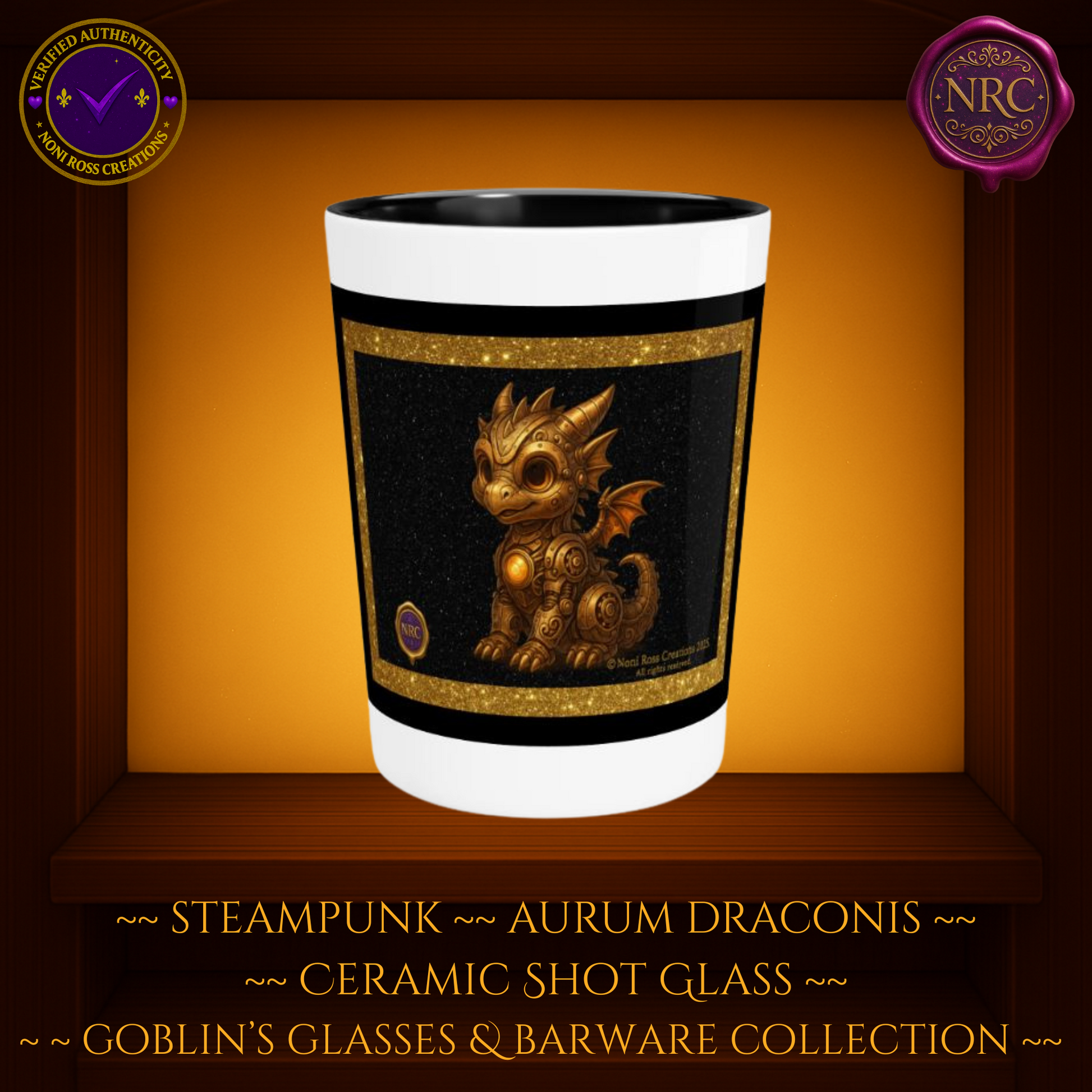 Steampunk Aurum Draconis Gold Dragon Ceramic Shot Glass by Noni Ross Creations