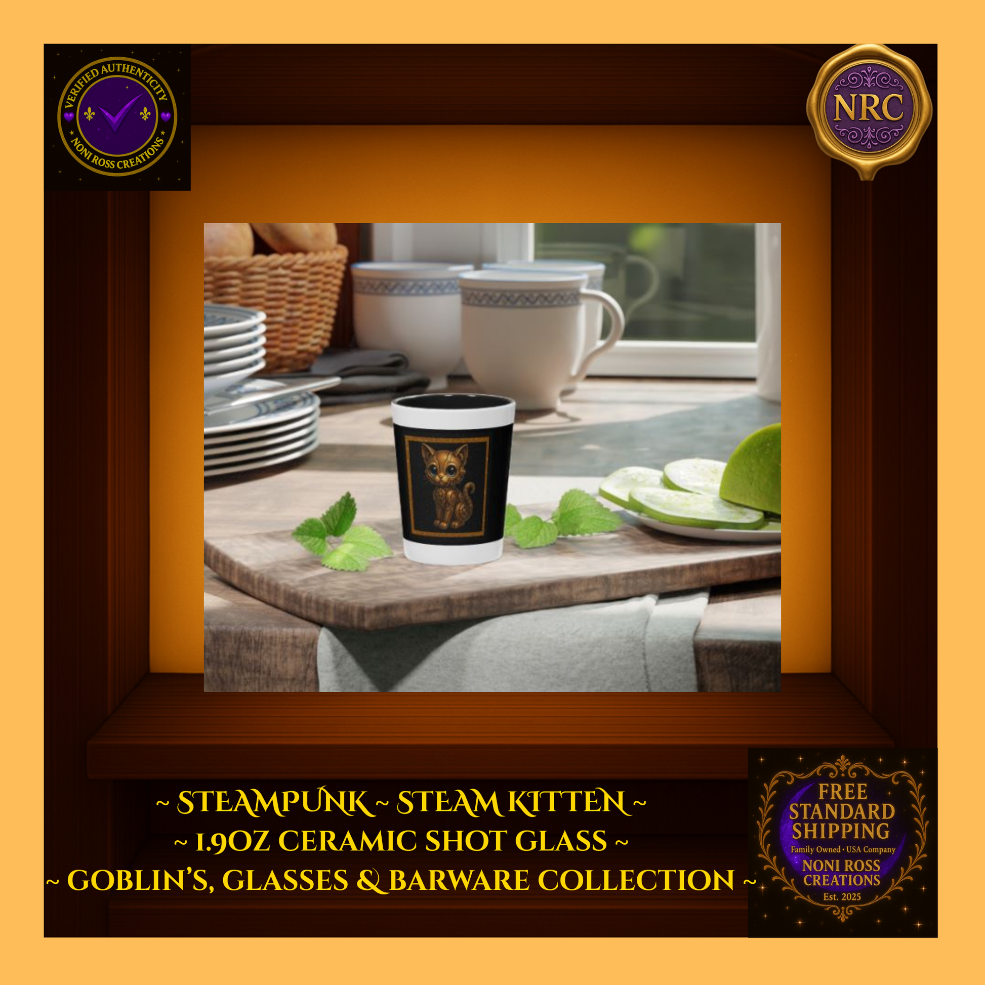 Embrace playful steampunk charm with the Steampunk Puss Ceramic Shot Glass from the Goblin’s Glasses & Barware Collection. This 1.9oz ceramic shot glass features an adorable mechanical kitten crafted with bronze gears, rivets, and wide, curious eyes — perfect for collectors, cat lovers, and steampunk fans alike.